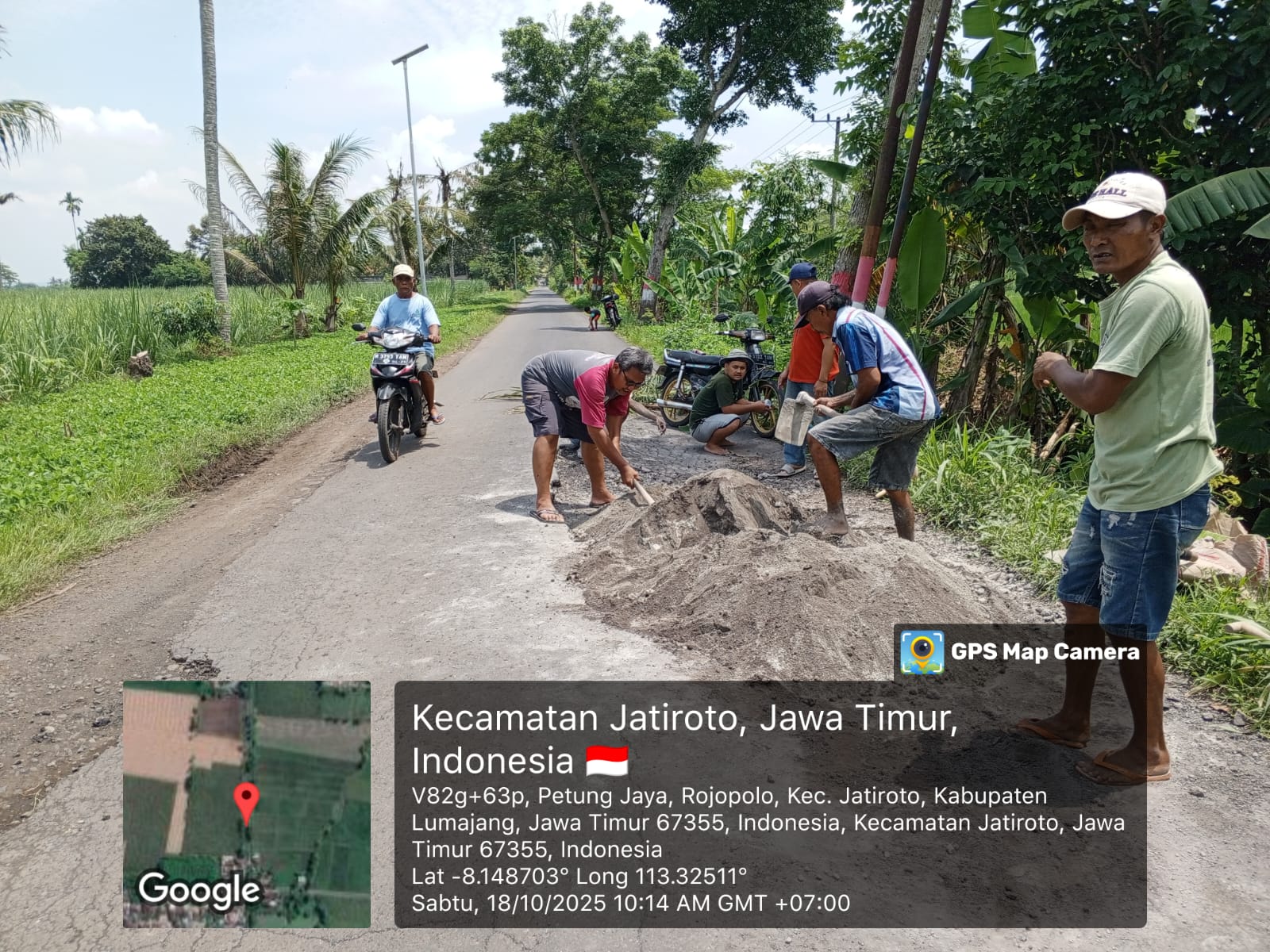Penambalan jalan berlobang oleh warga yang didanai oleh Kepala Desa (Kades) Rojopolo di beberapa titik lokasi itu, lantaran di jalan tersebut kerap kali menimbulkan korban akibat terjatuh dari kendaraannya.