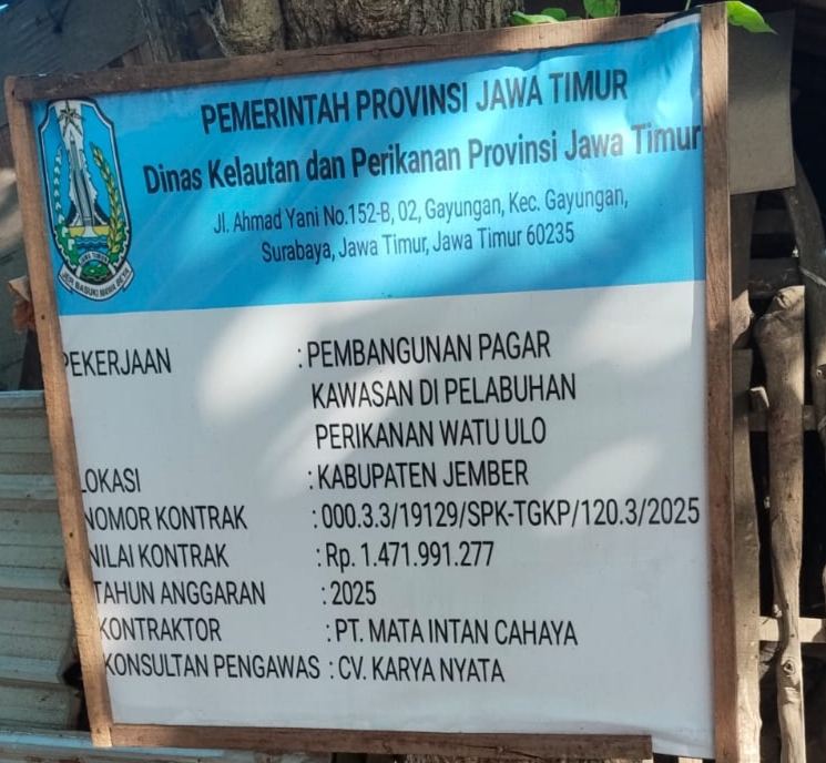 Proyek itu di bawah pengawasan Dinas Kelautan dan Perikanan Pemerintah Provinsi (Pemprov) Jawa Timur (Jatim) bernilai Rp1.471.991.277 tahun anggaran 2025, dengan nomor kontrak: 000.3.3/19129/SPK-TGKP/120.3/2025.