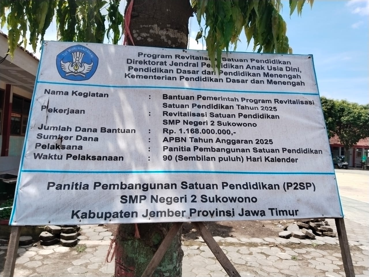 Berdasarkan papan informasi kegiatan yang terpasang di lokasi, revitalisasi SMPN 2 Sukowono beranggaran Rp1,168.000.000 (Satu miliar seratus enam puluh delapan juta rupiah), bersumber dari Anggaran Pendapatan Belanja Negara (APBN) tahun 2025.